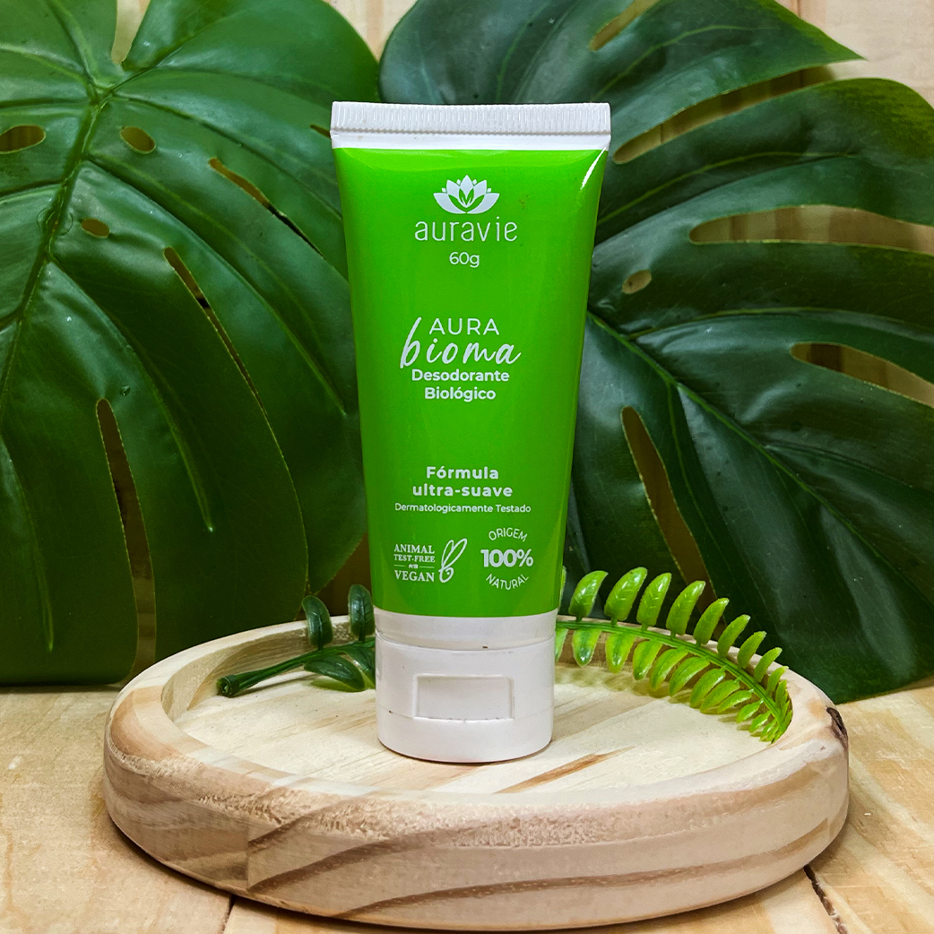 Equilibra o microbioma das axilas, diminuindo os odores da transpiração de uma maneira inteligente e sem desregular a microbiota da pele. Enquanto os desodorantes tradicionais exterminam as bactérias, o Aura Bioma usa a natureza a seu favor.
