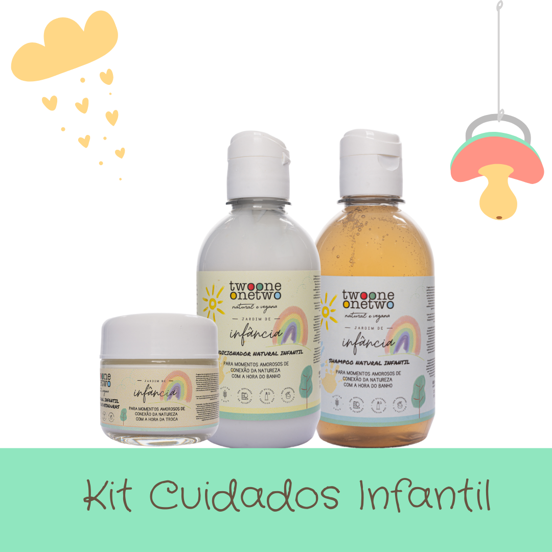 1 Shampoo Natural Infantil + 1 Condicionador Natural Infantil + 1 Creme natural infantil Preventivo de Assaduras.  Hipoalergênicos. Todos os produtos são livres de sulfatos, petrolatos, conservantes, fragrâncias e corantes artificiais. São enriquecidos com os melhores cuidados provenientes da natureza direto para a pele dos bebês e crianças.