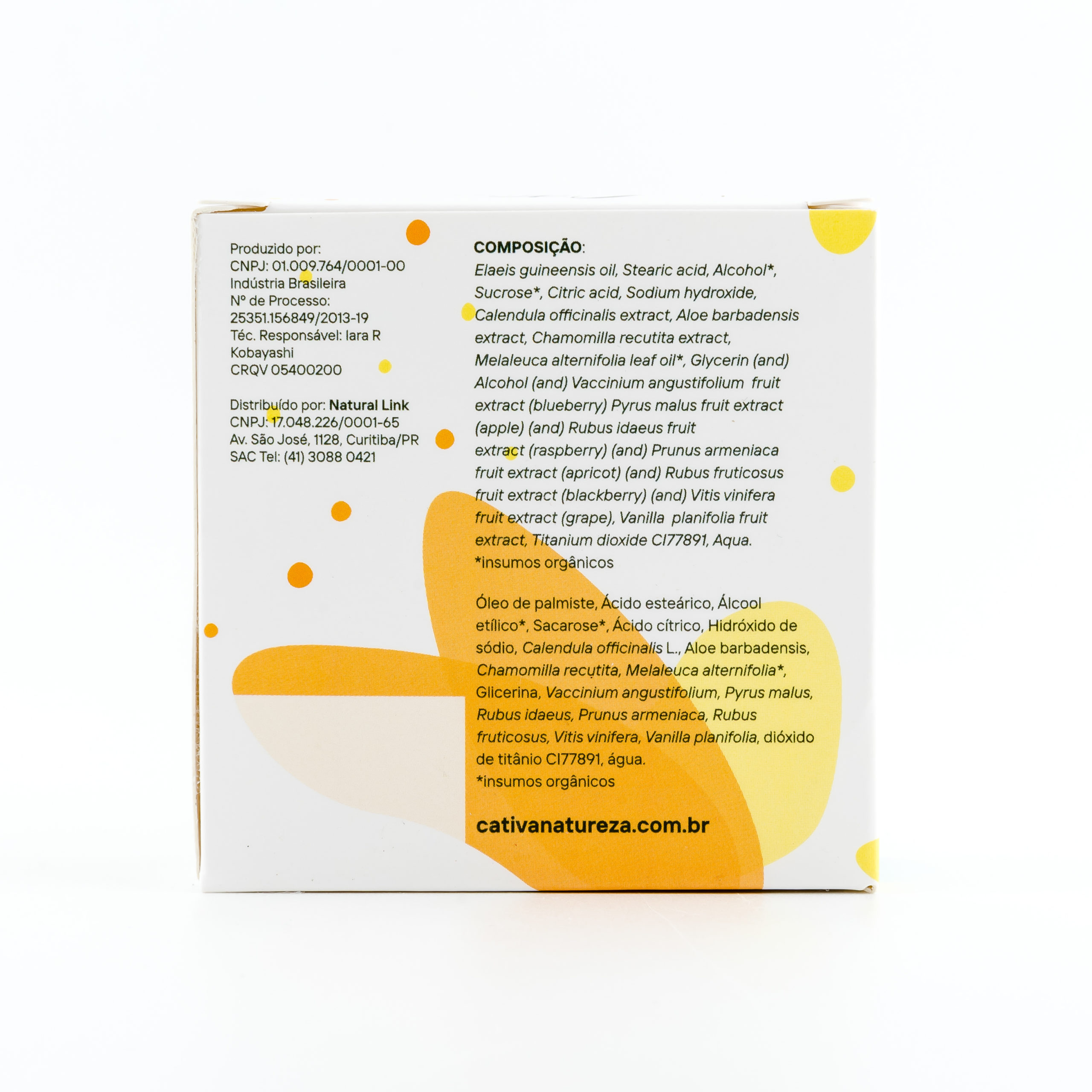 O Sabonete Vegetal de Calêndula foi desenvolvido para agir carinhosamente sobre a pele delicada e sensível, limpando com suavidade e mantendo a camada protetora da pele. Não resseca, nutre e protege. Pode ser usado diariamente em todos os tipos de pele, especialmente as mais sensíveis de bebês, crianças e idosos. Toda a proteção da Calêndula e Camomila com propriedades regeneradoras, calmantes e emolientes. Produto com alta tecnologia e os mais puros ingredientes da natureza. Apresenta fragrância natural com extratos de frutas, como Baunilha, Framboesa, Amora e Maçã, adicionados a uma base vegetal com Óleo de Babaçu e Extratos de Calêndula e Camomila, que possuem propriedades regeneradoras, calmantes e emolientes. Contém ainda extratos de Damasco, Uva, Blueberry, Babosa / Aloe Vera e Tea Tree.